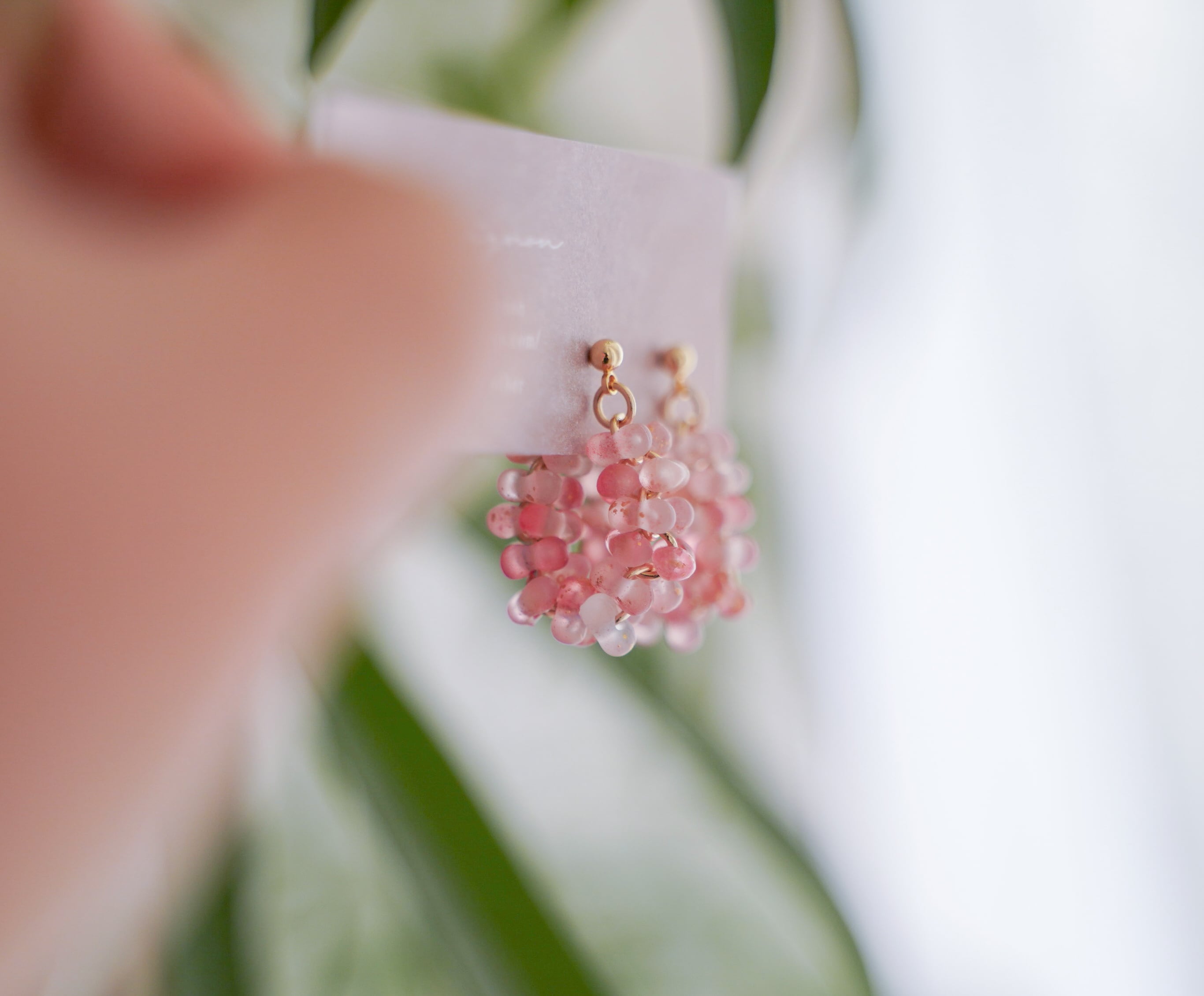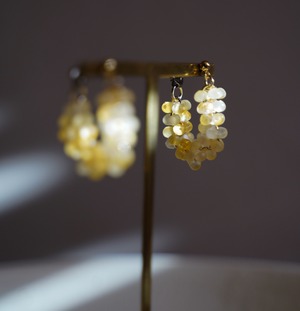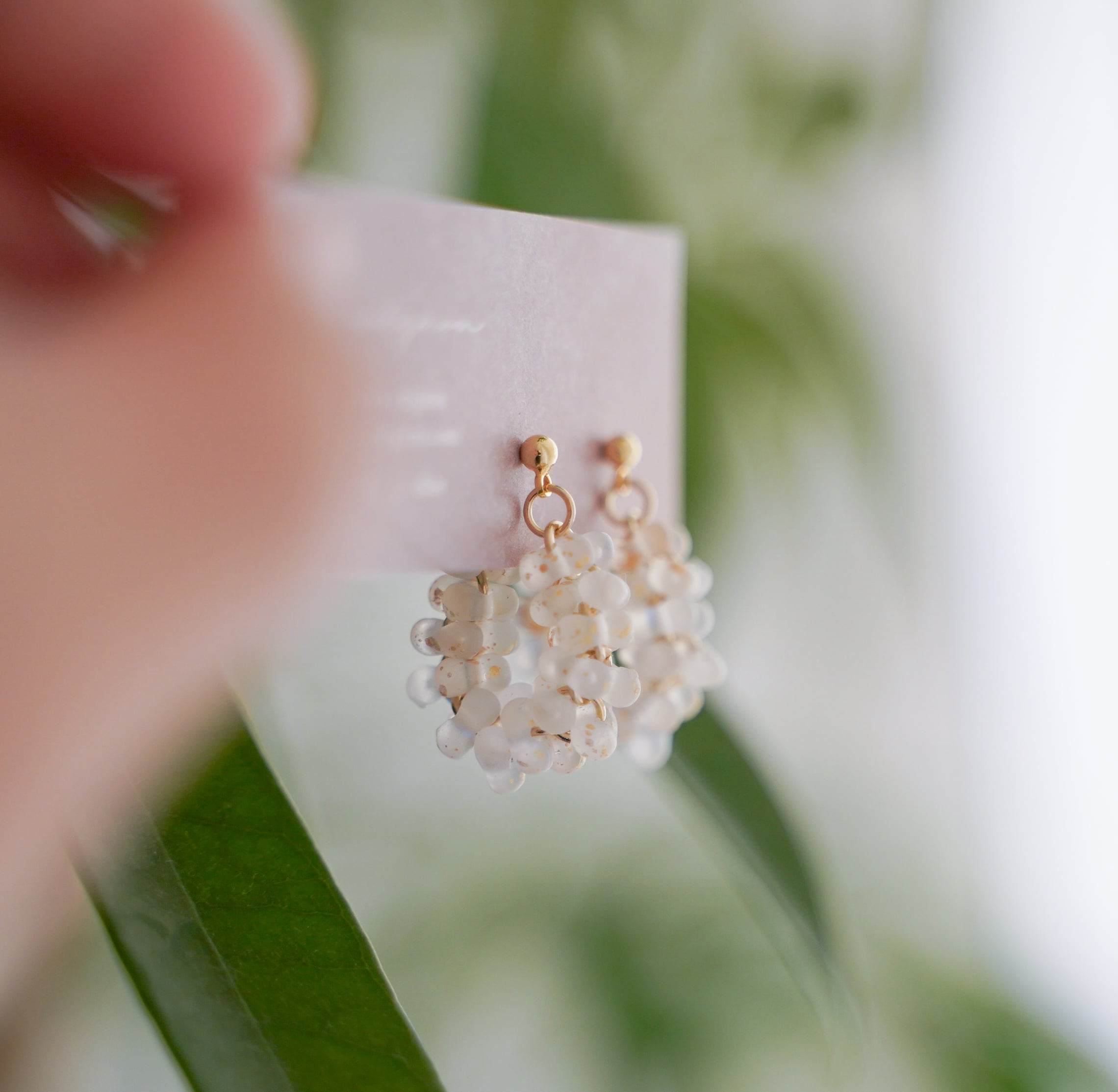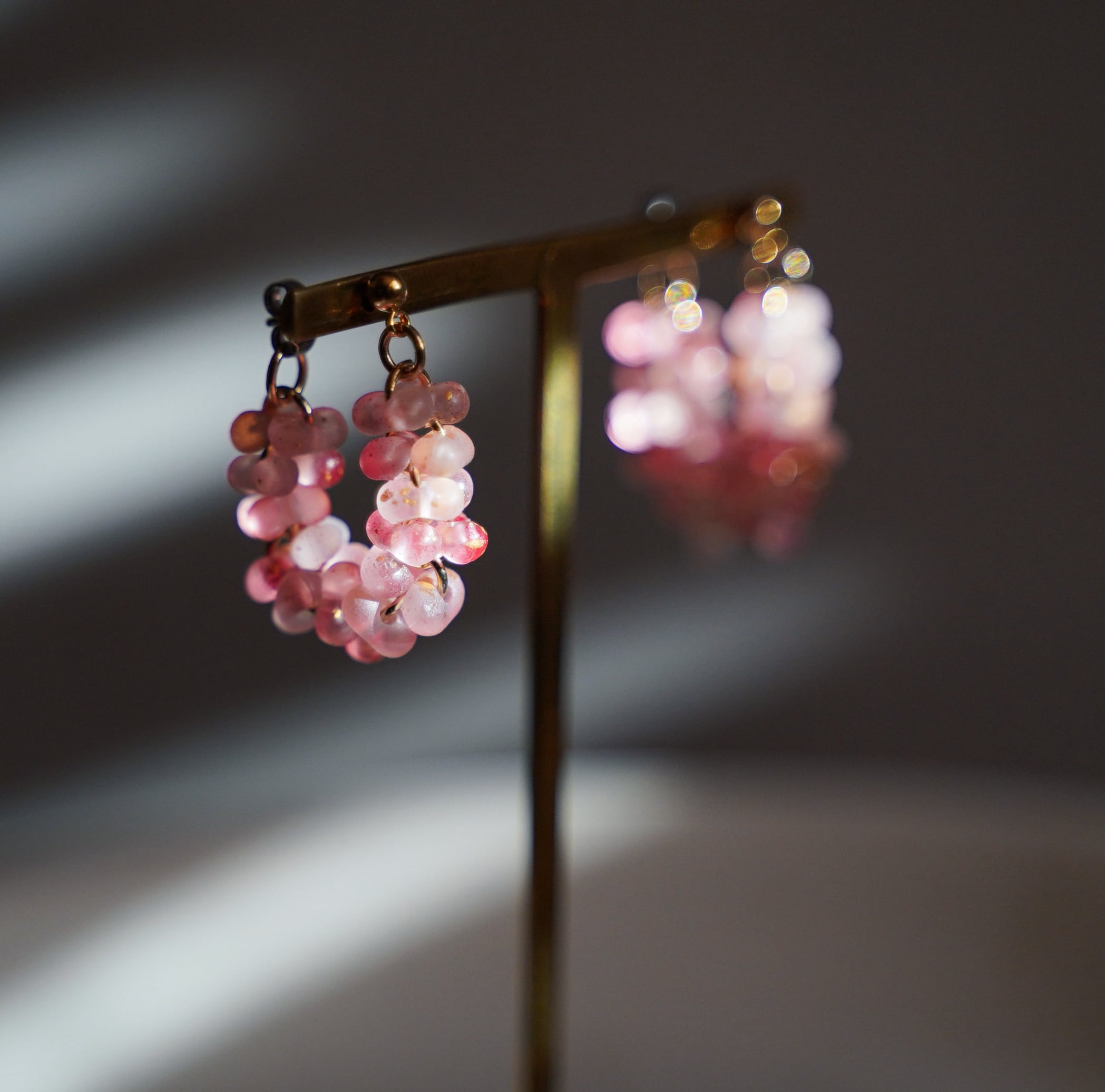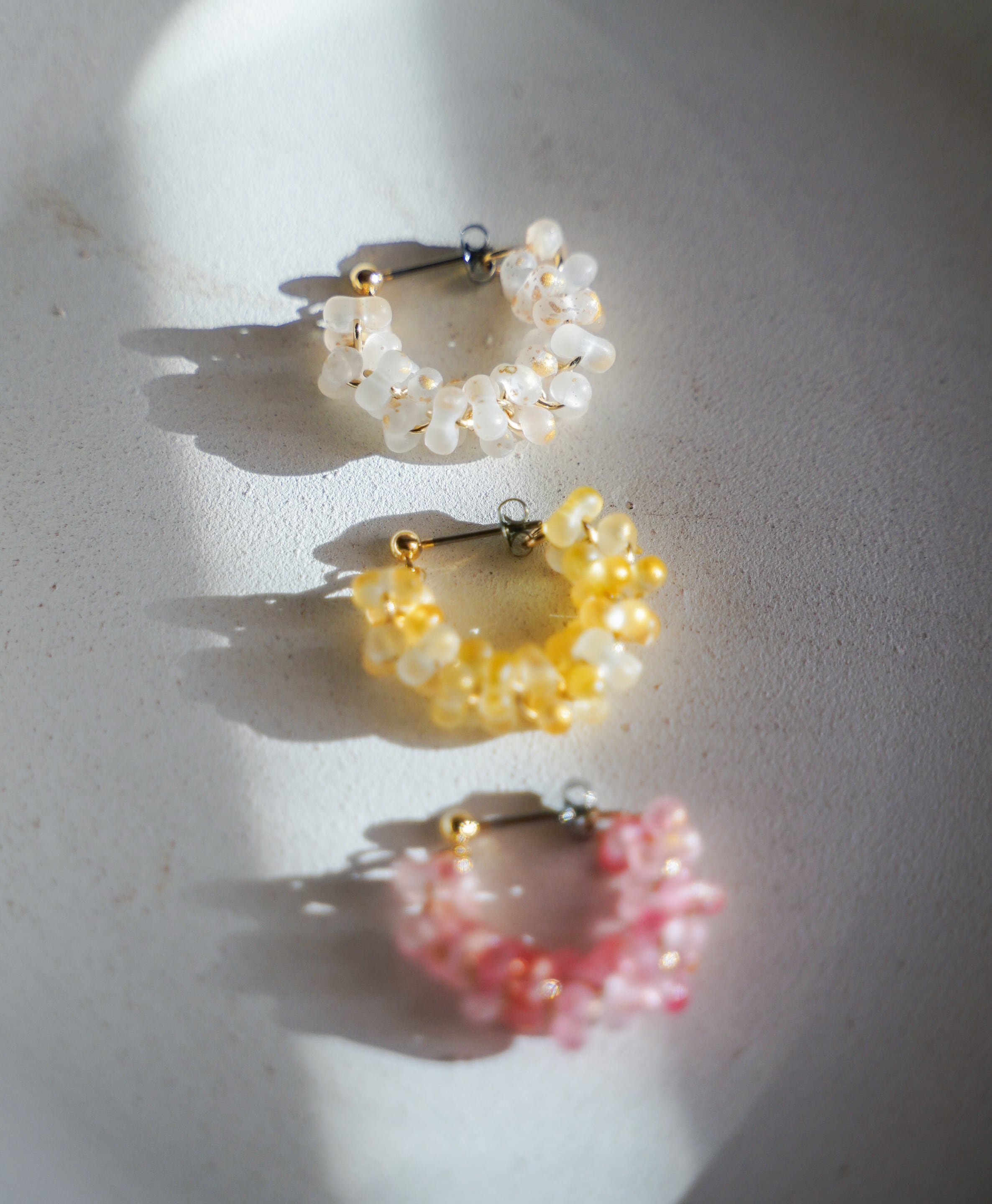 耳元からキャッチ部分まで、小粒のビーズをチェーンのように丁寧に繋げたハーフフープピアス。動くたびにビーズがきらりと揺れ、横顔まで美しく演出します。