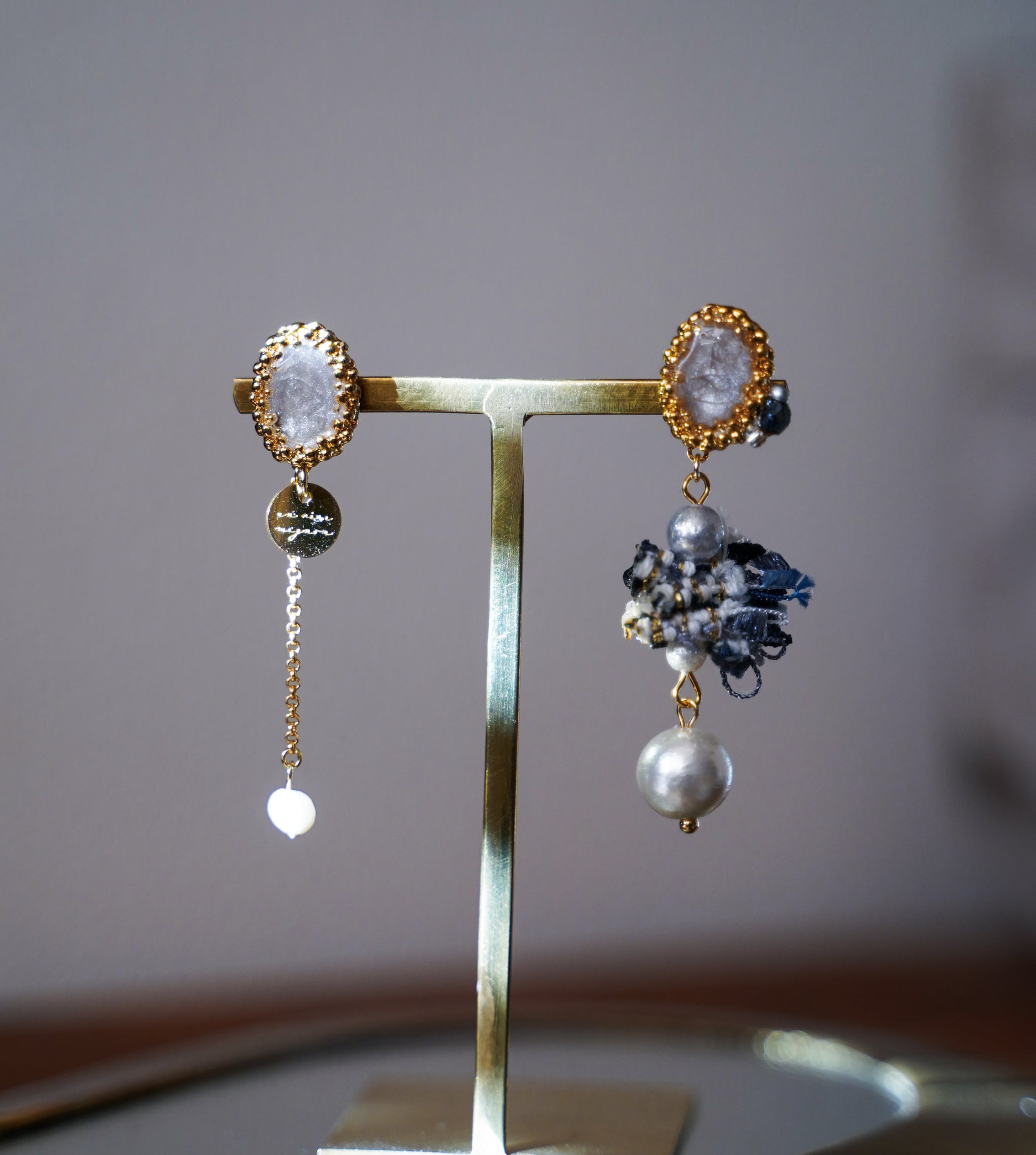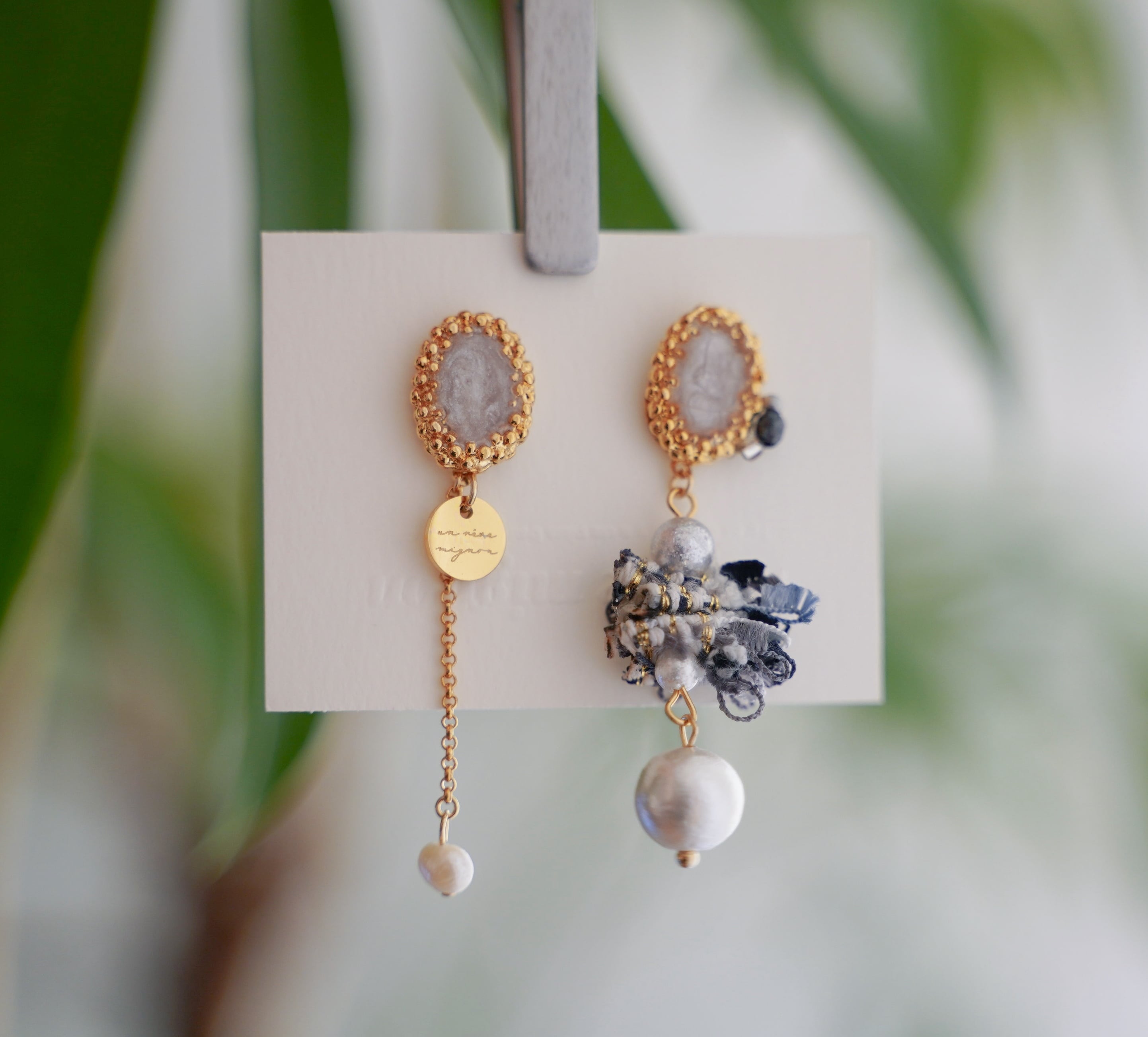 左右で異なるアシンメトリーデザインが、顔まわりを華やかに演出します。