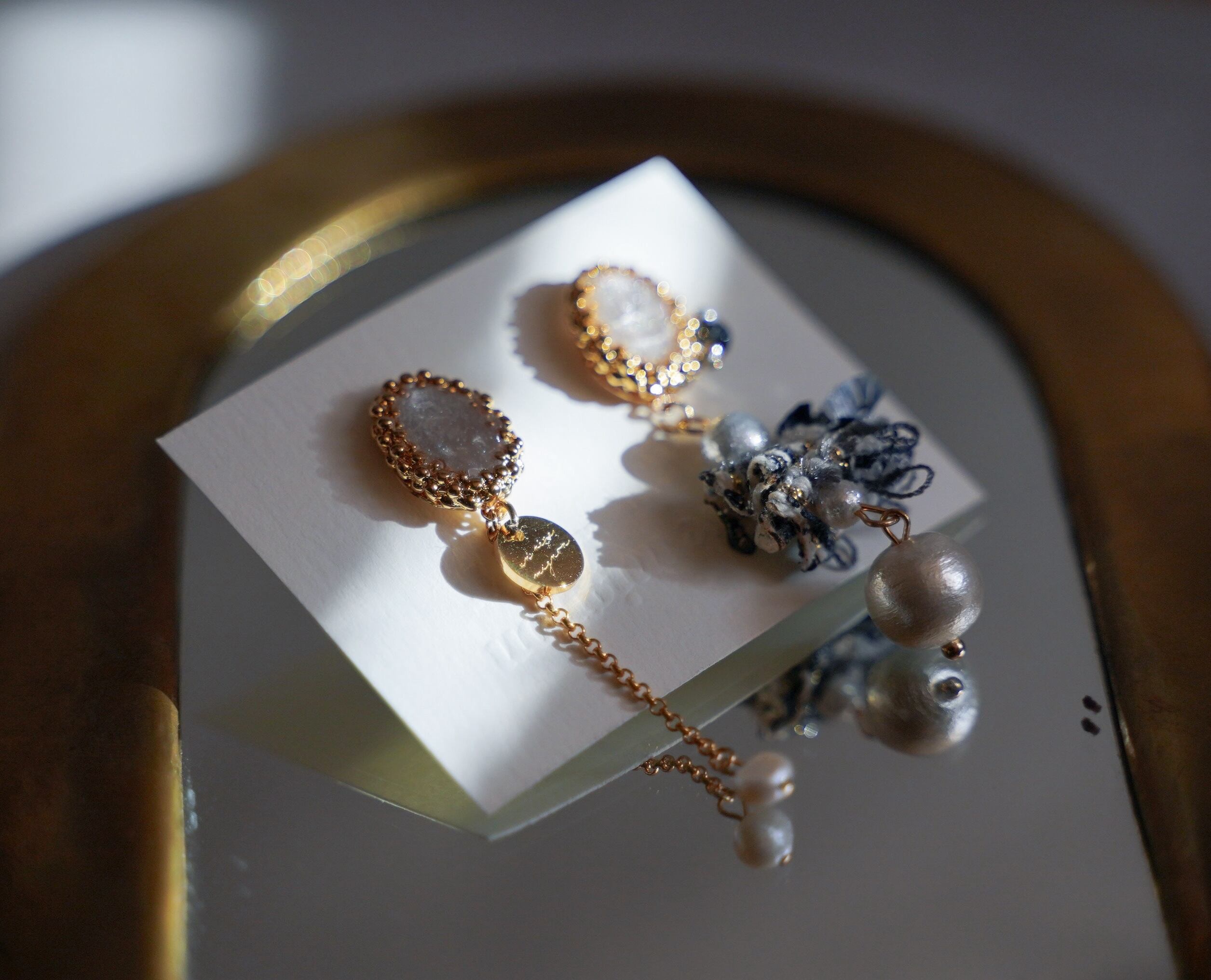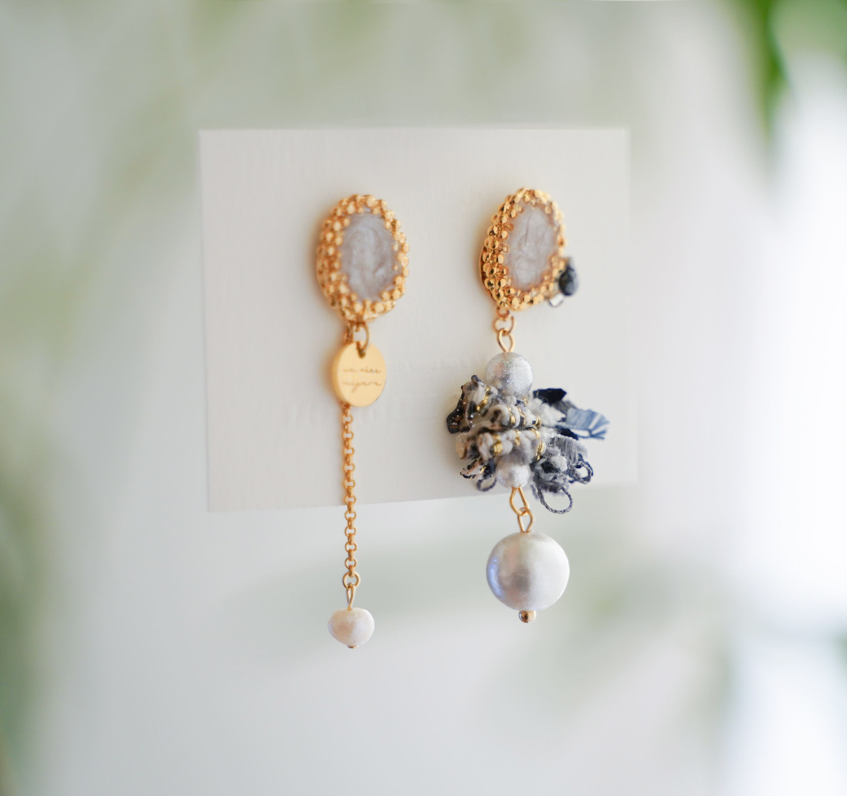 ブルーチェックと淡水パールのドロップピアスで、 女性らしさと可愛らしさをどちらも楽しめるデザインに仕上げました ♡