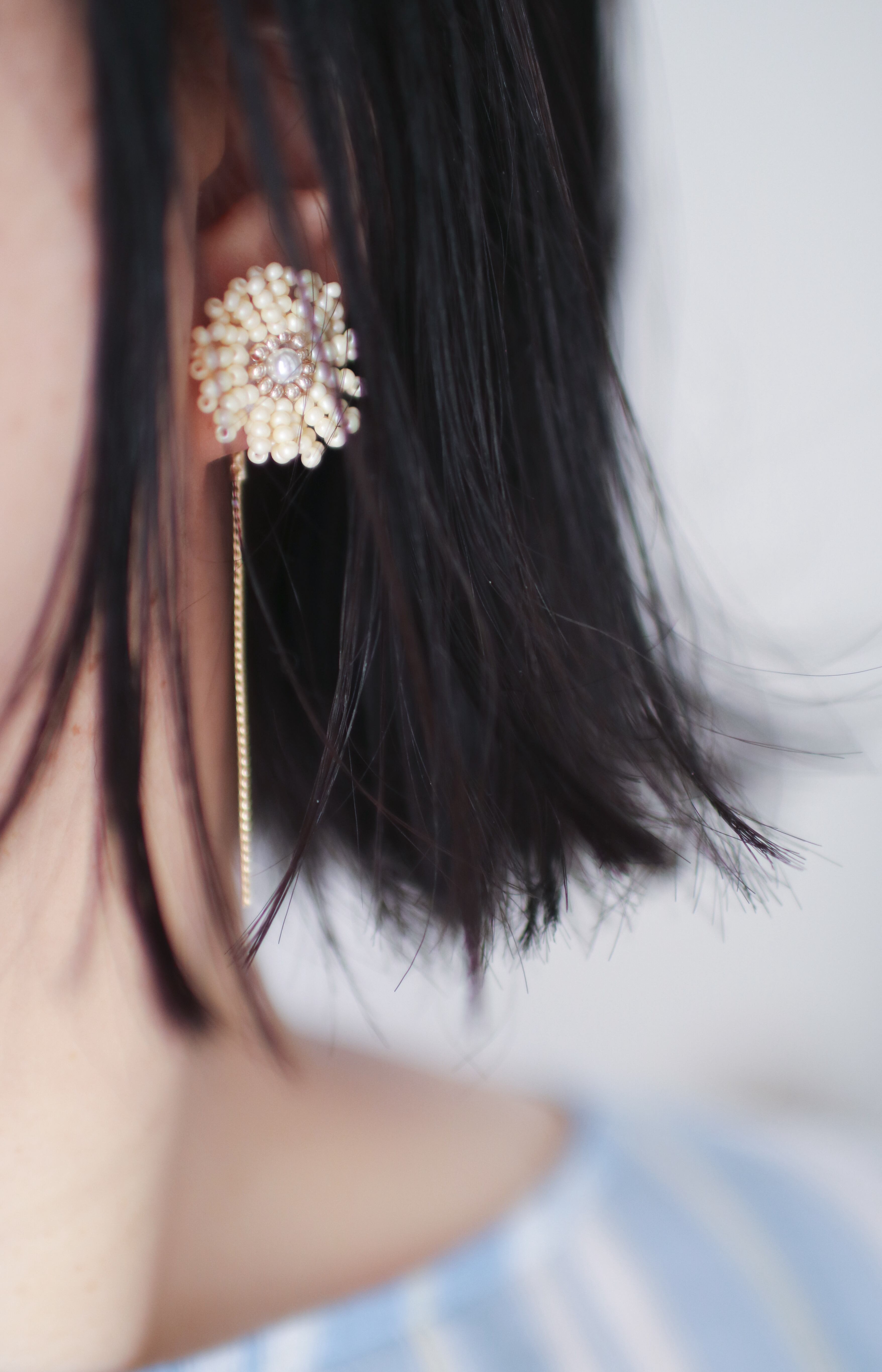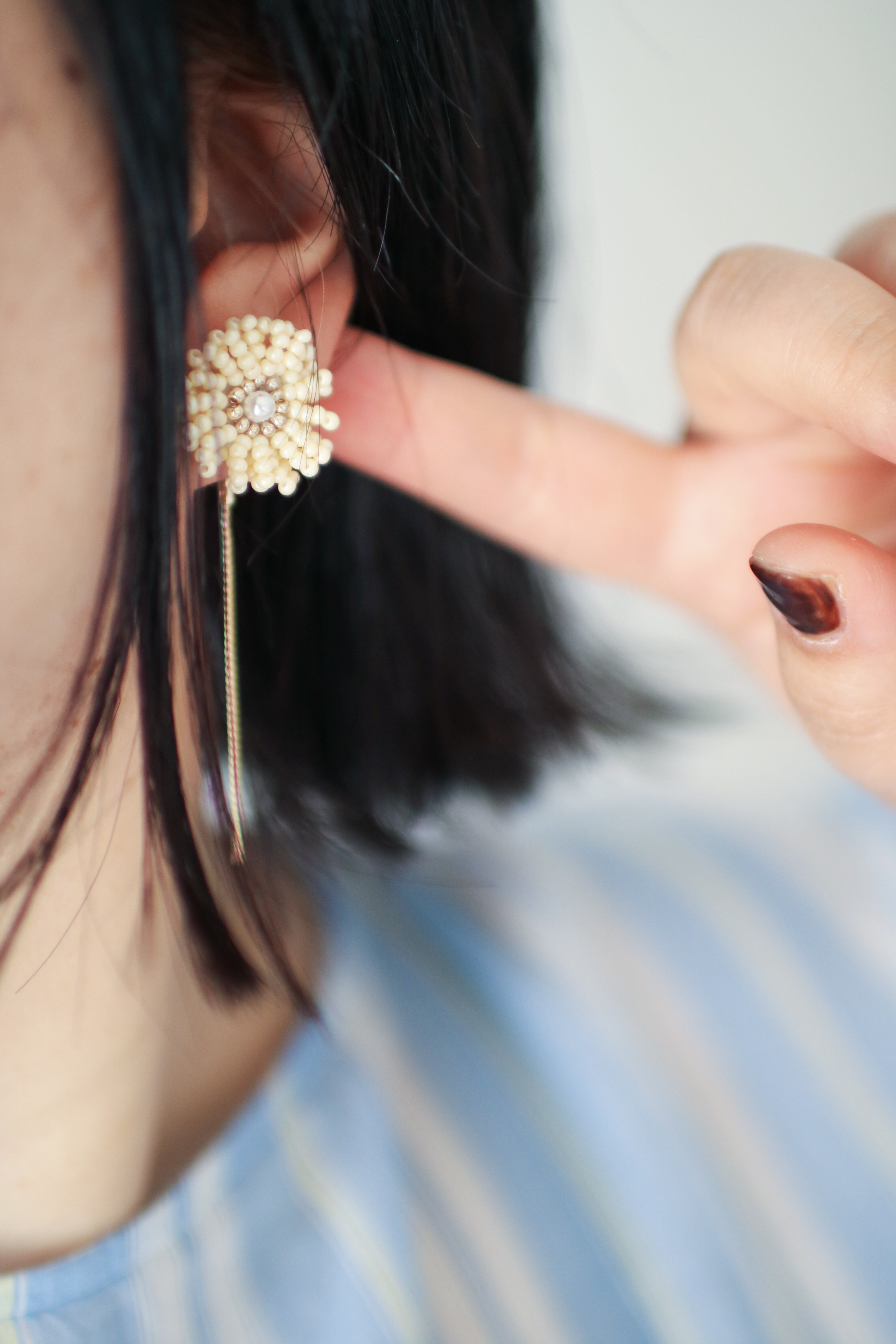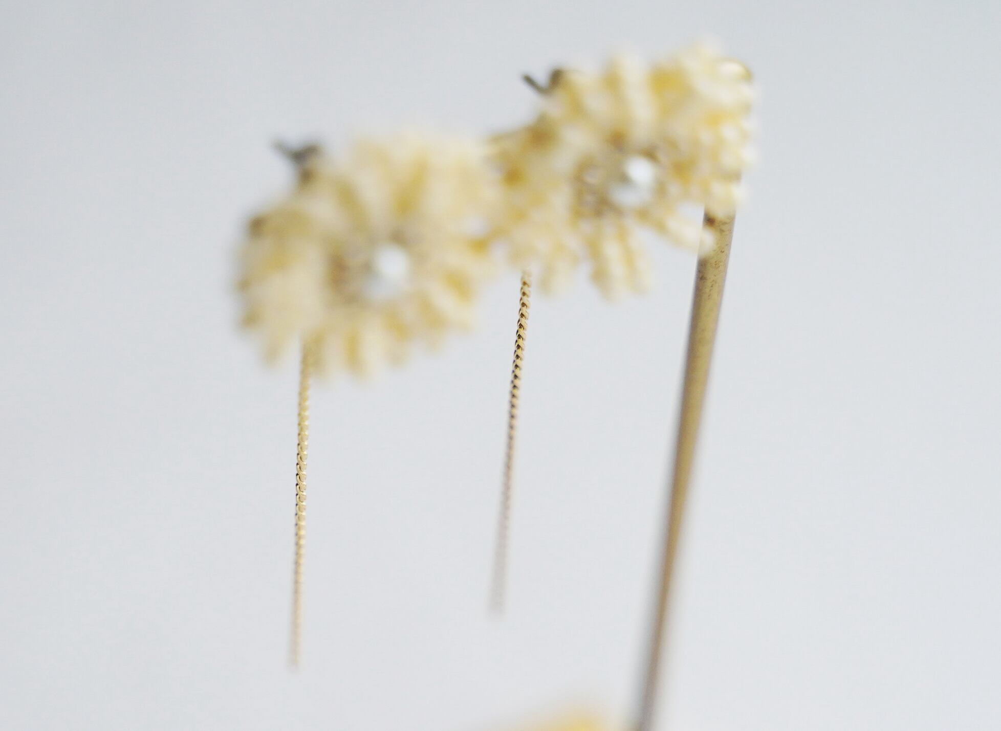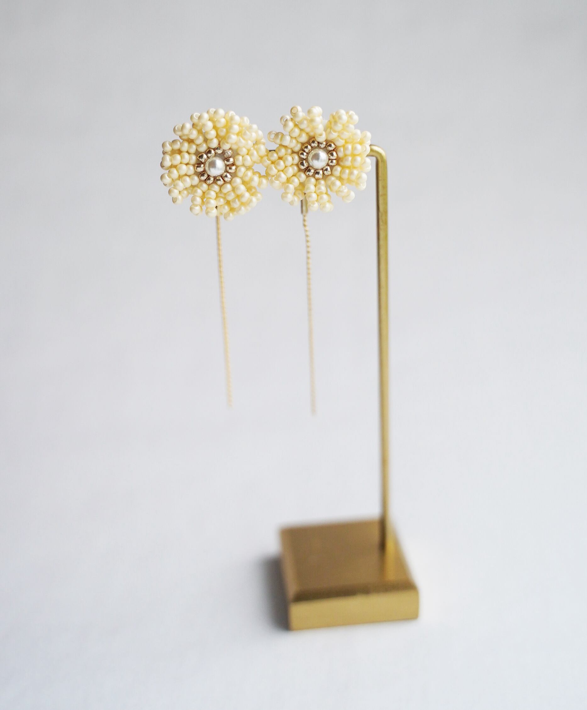 ゴールドデザインのチェーンキャッチがキラキラ揺れる2wayビーズピアスです。